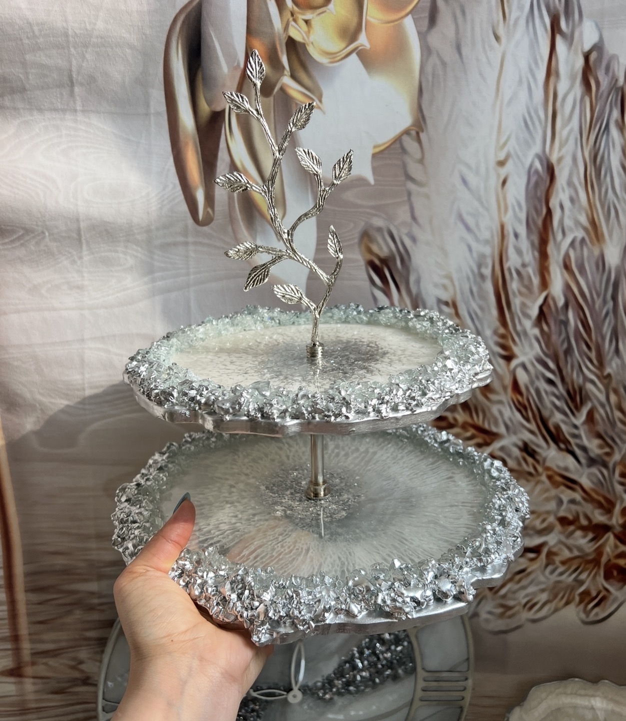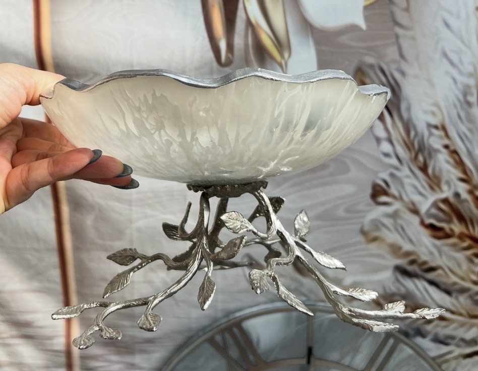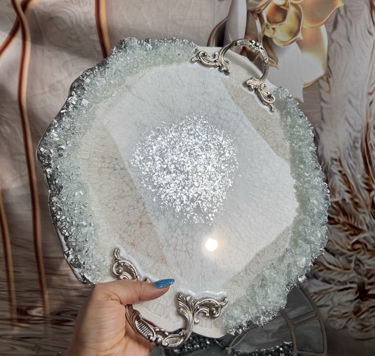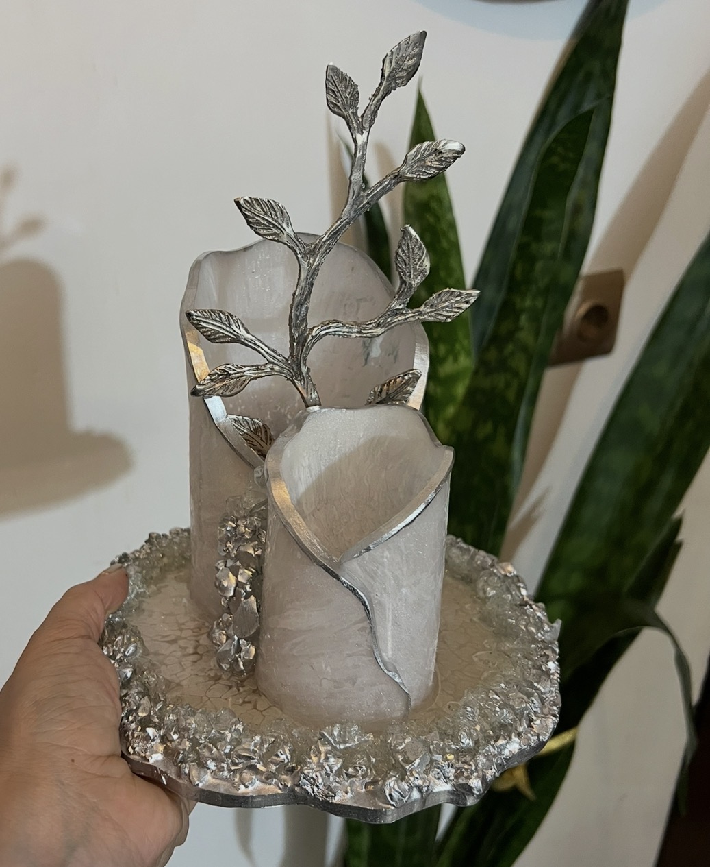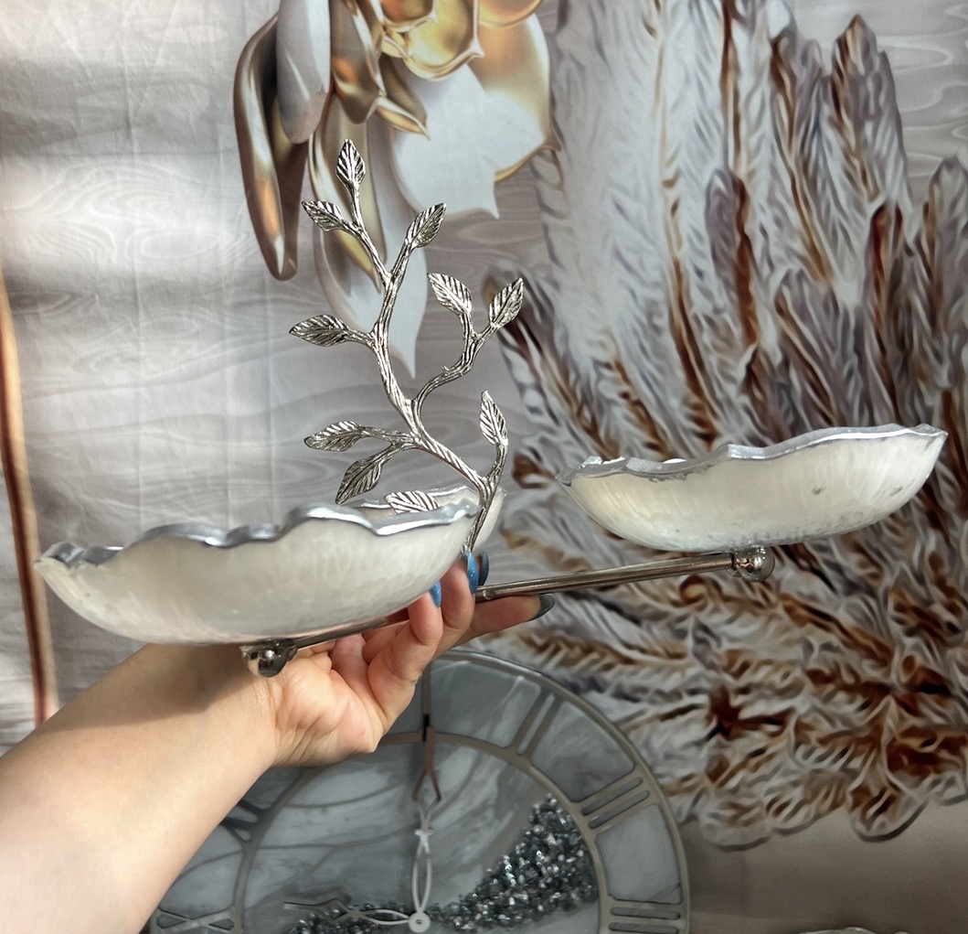 سرویس پذیرایی رزینی رنگ سفید عروس با پایه و هولدر برنجی برگ